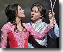 Netrebko and Alagna Triumph in Met Opera Mike Silverman, Associated Press, 26 September 2007 A case of the dueling divas seems to be settling over the stage of the Metropolitan Opera House and the only sure winner is the audience. On Tuesday, one night after French soprano Natalie Dessay created a sensation opening the season in Donizetti's "Lucia di Lammermoor," the spotlight fell on her Russian counterpart, Anna Netrebko, in Gounod's "Romeo et Juliette." Perhaps by coincidence, perhaps not, Netrebko was reprising a role that Dessay had sung at the Met two seasons ago when the production was first introduced. More intriguing still, Netrebko is tentatively slated to take over the role of Lucia next year and also to star in Massenet's "Manon" the latter a role Dessay has recently added to her repertoire. When singers are at as high a level as these two, comparisons can only be flattering. Netrebko gave a striking performance as the ill-fated daughter of the Capulets, sparkling on her high notes in the Waltz Song, blending smoothly in her duets with Romeo (tenor Roberto Alagna) and rising to great heights of dramatic expressiveness in the aria "Amour, ranime mon courage," when she takes the sleeping potion that is supposed to allow her to escape with her beloved. She may not summon up the image of an innocent teenager as effortlessly as Dessay did in the opening act, but she and Alagna make as sexy a pair of young lovers as one could ever hope to see in the bedroom scene. (And yes, the floating bed that most distinguishes this production by Guy Joosten is still on display.) Moreover, her sturdy lyric sound, tinged with that slight melancholy characteristic of Russian singers, is arguably better suited than Dessay's more fragile tone to fill out Gounod's lush melodic lines. And what of Alagna, making his first Met appearance since his notorious walkout at La Scala last December after being booed for his opening aria in Verdi's "Aida"? The French-Sicilian tenor has always seemed most at home in the French repertory, and his Romeo was no exception. He has definitely lost some of the ease in the upper register that he displayed when he sang the role here a decade ago, but his singing was ardent and ultimately winning. Alagna is singing only one more performance of the role, this Saturday, before switching over to Puccini's "Madama Butterfly." Originally, tenor Rolando Villazon was to be Netrebko's partner for the entire run, but he has canceled all appearances through the remainder of the year. Joseph Kaiser and Matthew Polenzani will sing later Romeos. Repeating from two years ago, baritone Stephane Degout (subbing for an indisposed Nathan Gunn) was a dashing Mercutio, and bass Kristin Sigmundsson brought gravitas to the role of Friar Laurence. In the brief "trousers" role of Stephano, debuting mezzo Isabel Leonard showed she's a spirited performer well worth keeping an eye on. Placido Domingo, who in his younger days sang Romeo at the Met himself, conducted the orchestra, showing a nice feel especially for the many tender moments of the score. The Lovers of Verona, Swaggering and Soaring Anne Midgette, The New York Times, 27 September 2007 After the buildup to the opening night of the season, you can expect a certain falloff. But the second night of the Metropolitan Opera's season on Tuesday was terrific. Guy Joosten's production of Gounod's "Roméo et Juliette" glows with bright blues, the warm tones of inlaid wood and backgrounds of spiraling colored galaxies and stars. When the production opened in November 2005, I found it saccharine. But on Tuesday its jewel-like colors and jewel-box compartments were an appropriate setting for an opera that revealed one vocal jewel after another. You are not going to hear much better singing than this today. True, Anna Netrebko and Roberto Alagna can both be faulted. She is a little wild, flinging herself into roles and about the stage (especially, on Tuesday, at her first entrance); he has a certain emotional bluntness, and a certain monochrome tone. So much for the obligatory criticism. The bottom line is that Ms. Netrebko produced a luscious sound that you wanted to bathe in forever, especially in her first-act duet with Mr. Alagna. The ultimate measure for a singer should be, Is this a sound you want to listen to? The answer here was yes. Mr. Alagna was less purely luxurious, but certainly no slouch. His approach involves pumping out sound, but there was some pretty nice sound pumped out, especially in his aria "Ah! lève-toi, soleil!" At its best, his voice is ringing, ardent, firm; at its worst, a little tight, with a tendency to swoop upward to find the higher pitches. But he more than met the criterion mentioned above. Wisely, the producers dispensed with the purple tights poor Ramón Vargas had to wear when this production opened; in lieu of these, Mr. Alagna got some powder-blue pants and matching boots that made it appear as if medieval Verona were receiving a visit from Johnny Cash. The delight did not stop at the two principals. Stéphane Degout was an adroit, limber Mercutio. Kristinn Sigmundsson was strong, warm and easy as Friar Laurence. And making her company debut with remarkable aplomb as Stéphano was Isabel Leonard, a young Juilliard graduate who sang with the assurance of one who feels completely at home on the stage, wielding an easy mezzo that went up from an amber-colored lower register to an impressive, sopranolike top. It is hard to make a splash in a pants role in a long opera on a night when Anna Netrebko is singing, but Ms. Leonard did. The other, less exciting singers included Marc Heller (Tybalt), David Won (Grégorio), Louis Otey (Paris) and John Hancock as a rather raspy Capulet. Plácido Domingo's presence in the pit added extra luster to the evening, if not always to the music. He was earnest and careful, but he sounded a little out of his depth, from the muddy fugue that dragged down the overture. And if the singer